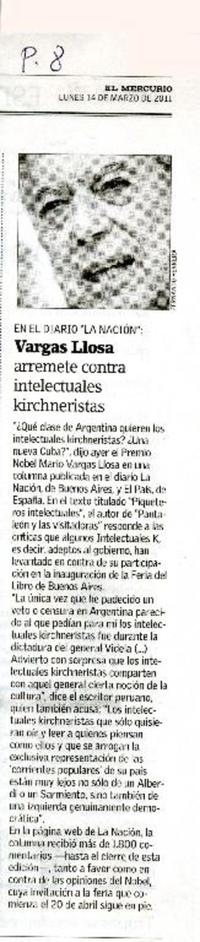 Vargas Llosa arremete contra intelectuales Kirchneristas [artículo] El Mercurio (Diario : Santiago, Chile)-- mar. 14, 2011, p. 8 .