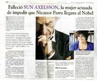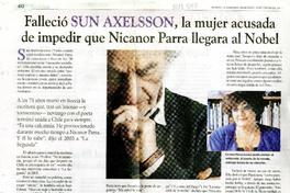 Falleció Sun Axelsson, la mujer acusada de impedir que Nicanor Parra llegara al Nobel [artículo] La Segunda (Diario : Santiago, Chile)-- ene. 19, 2011, p. 40 .