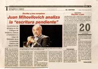 Juan Mihovilovich analiza la escritura pendiente [artículo] / Vanessa Garrido. El Centro (Diario : Talca, Chile)-- mar. 31, 2011, p. 23 .
