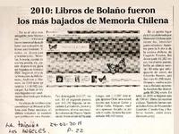 2010 : libros de Bolaño fueron los más bajados de Memoria Chilena [artículo] La Tribuna (Diario : Los Ángeles, Chile)-- feb. 24, 2011, p. 22 .