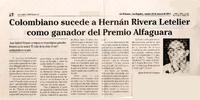 Colombiano sucede a Hernán Rivera Letelier como ganador del premio Alfaguara [artículo]. La Tribuna (Diario : Los Ángeles, Chile)-- mar. 22, 2011, p. 22 .