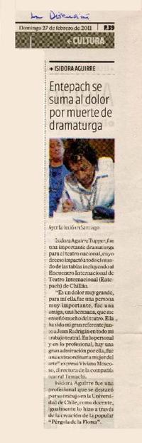 Entepach se suma al dolor por muerte de dramaturga [artículo]. La Discusión (Diario : Chillán, Chile)-- feb. 27, 2011, p. 39 .