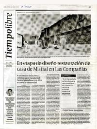 En etapa de diseño restauración de casa de Mistral en las Compañías [artículo] El Día (Diario : La Serena, Chile)-- mar. 4, 2011, p. 27 .