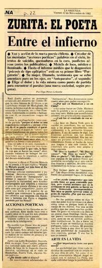 El poeta escandaloso, entre el infierno y el paraíso (entrevista) [artículo] / Elga Pérez Laborde. La Segunda (Diario: Santiago, Chile)-- nov. 12, 1982, p. 22-23. .