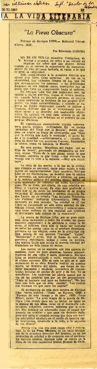La pieza obscura [artículo] / Edmundo Concha. Las Últimas Noticias (Diario : Santiago, Chile)-- nov. 30, 1963, p. 23. .