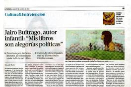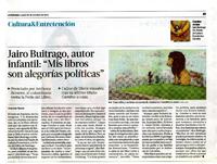 Jairo Buitrago, autor infantil: "Mis libros son alegorías políticas" [artículo] Graciela Marin. La Tercera (Diario : Santiago, Chile)-- oct., 29, 2012, p. 61. .