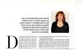 Esta renombrada crítica gastronómica decidió cruzar la frontera y lanzar sus propias recetas. El resultado solo se verá en las cocinas, pero desde ya se puede empezar por disfrutar este precioso y sencillo cuaderno que un tiene sello personal inconfundible. [artículo] Cosas (Revista : Santiago, Chile)-- nº 938 (sep, 2012) p. 75-76. .