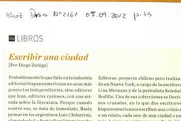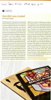 Escribir una ciudad [artículo] Diego Zuñiga Qué Pasa (Revista : Santiago, Chile)-- nº 2161 (sep. 2012), p. 73 .