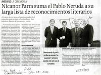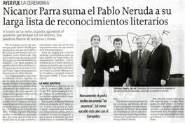 Nicanor Parra suma el Pablo Neruda a su larga lista de reconocimientos literarios [artículo] El Sur (Diario : Concepción, Chile)-- ago. 09, 2012, p. 22 .