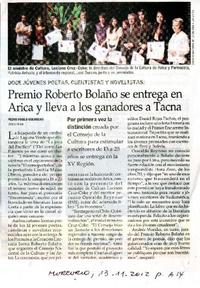Premio Roberto Bolaño se entrega en Arica y lleva a los ganadores a Tacna [artículo] / Pedro Pablo Guerrero El Mercurio (Diario : Santiago, Chile)-- nov. 13, 2012, p. A14 .