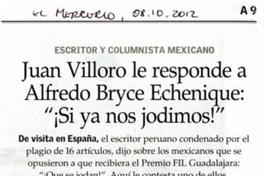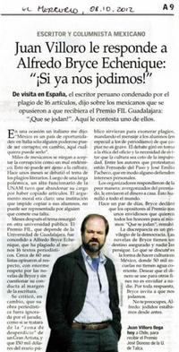 Escritor y columnista mexicano Juan Villoro le responde a Alfredo Bryce Echenique: "¡Si ya nos jodimos!" [artículo] El Mercurio (Diario : Santiago, Chile)-- oct. 08, 2012, p. A9 .