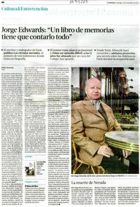 Jorge Edwards: "Un libro de memorias tiene que contarlo todo" [artículo] / Erika Olavarría. La Tercera (Diario : Santiago, Chile)-- nov. 4, 2012, p. 60 .
