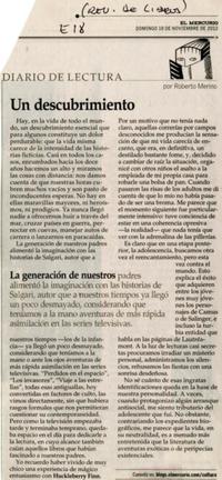Un descubrimiento [artículo] Roberto Merino El Mercurio (Diario : Santiago, Chile)-- nov. 18, 2012, p. E18 (Revista de Libros) .