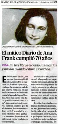 El mítico Diario de Ana Frank cumplió 70 años [artículo]/ El Mercurio (Diario : Antofagasta, Chile)-- jun. 13, 2012, p. 27 .