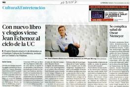 Con nuevo libro y elogios viene Jean Echenoz al ciclo de la UC [artículo]/ Javier García La Tercera (Diario : Santiago, Chile)-- nov. 17, 2012, p.102 .