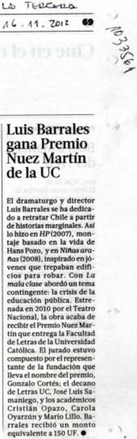 Luis Barrales gana premio Nuez Martín [artículo]/ La Tercera (Diario : Santiago, Chile)-- nov. 16, 2012, p. 69 .