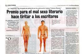 Premio para el mal sexo literario hace tiritar a los escritores [artículo]/ Rodrigo Castillo Las Últimas Noticias (Diario : Santiago, Chile)-- dic. 7, 2012, p. 76 .