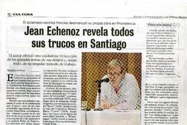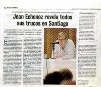 Jean Echenoz revela todos sus trucos en Santiago [artículo]/ Rodrigo Castillo Las Últimas Noticias (Diario : Santiago, Chile)-- dic. 5, 2012, p. 54 .