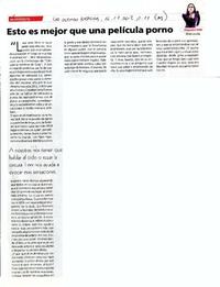 Esto es mejor que una película porno [artículo] / Alejandra Valle Las Últimas Noticias (Diario : Santiago, Chile)-- nov. 16, 2012, p. 11-13 (M) .