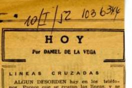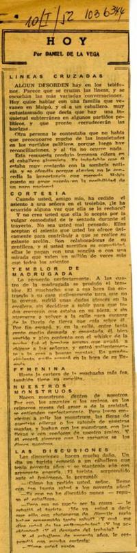 Líneas cruzadas [artículo] / Daniel de la Vega Las Últimas Noticias (Diario : Santiago, Chile)-- ene. 10, 1952, p. 4. .