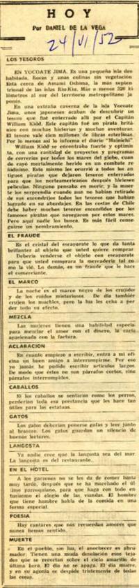Los tesoros [artículo] / Daniel de la Vega Las Últimas Noticias (Diario : Santiago, Chile)-- jun. 24, 1952, p. 4. .