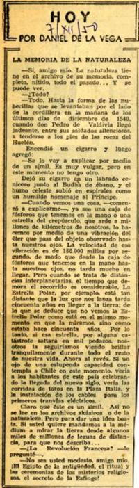 La memoria de la naturaleza [artículo] / Daniel de la Vega Las Últimas Noticias (Diario : Santiago, Chile)-- dic. 7, 1950, p. 4. .