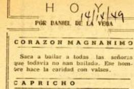 Corazón magnanimo [artículo] / Daniel de la Vega Las Últimas Noticias (Diario : Santiago, Chile)-- sep. 14, 1949, p. 4. .