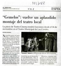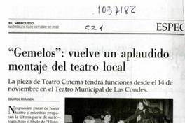 "Gemelos": vuelve un aplaudido montaje del teatro local [artículo] / Eduardo Miranda El Mercurio (Diario : Santiago, Chile)-- oct. 31, 2012 p. C21 .