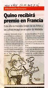 Quino recibirá premio en francia [artículo] / Hoy X Hoy (Diario : Santiago, Chile)-- nov. 27, 2012, p. 15 .