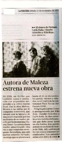 Autora de Maleza estrena nueva obra [artículo] / La Tercera (Diario : Santiago, Chile)-- nov. 24, 2012, p. 92 .