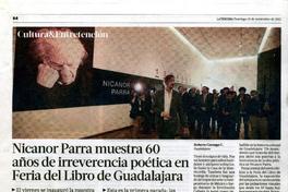 Nicanor Parra muestra 60 años de irreverencia poética en Feria del Libro de Guadalajara [artículo] / Roberto Careaga C. La Tercera (Diario : Santiago, Chile)-- nov. 25, 2012, p. 84-85 .