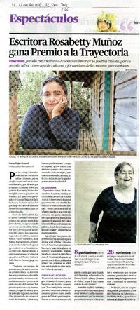 Escritora Rosabetty Muñoz gana Premio de la Trayectoria [artículo] / Oscar Rojas Connell El Llanquihue (Diario : Puerto Montt, Chile)-- nov., 23, 2012, p.4 (Fin de Semana) .