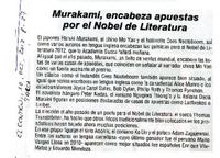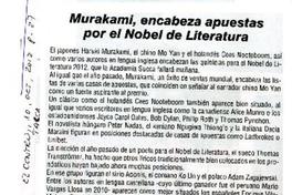 Murakami, encabeza apuestas por el Nobel de Literatura [artículo] / El Centro (Diario : Talca, Chile)-- oct. 10, 2012, p. 27 .