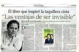 El libro que inspiró la taquillera cinta "Las ventajas de ser invisible" [artículo] / Camila Ortiz Miranda El Mercurio (Diario : Santiago, Chile)-- ene. 17, 2013, p. A10 .