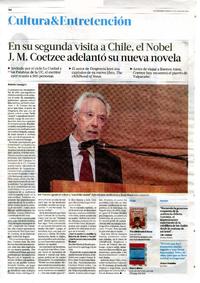 En su segunda visita a Chile, el Nobel J.M. Coetzee adelantó su nueva novela [artículo] / Roberto Careaga C. La Tercera (Diario : Santiago, Chile)-- abr. 13, 2013, p. 36 .