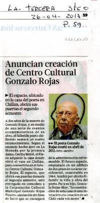 Anuncian creación de centro cultural Gonzalo Rojas [artículo] La Tercera de La Hora (Diario : Santiago, Chile)-- abr. 26, 2013, p. 59. il. .