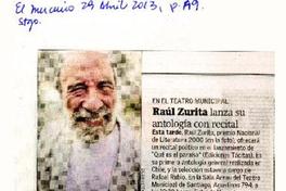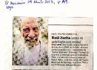 Raúl Zurita lanza su antología con recital. [artículo] El Mercurio (Diario : Santiago, Chile) abr. 29, 2013, p. A9. .