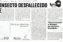 Insecto desfallecido [artículo] / Tal Pinto The Clinic (Diario : Santiago, Chile)-- mar. 21, 2013, p. 29 .