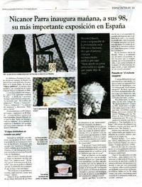 Nicanor Parra inaugura mañana, a sus 98, su más importante exposición en España [artículo] / La Segunda (Diario : Santiago, Chile)-- may. 29, 2013, p. 33 .