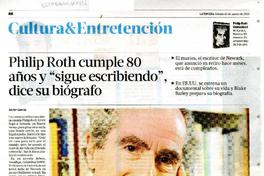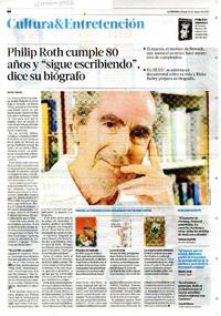 Philip Roth cumple 80 años y "sigue escribiendo" dice su biógrafo [artículo] / Javier García. La Tercera de la Hora (Diario: Santiago, Chile)-- mar. 16, 2013, p. 86. .