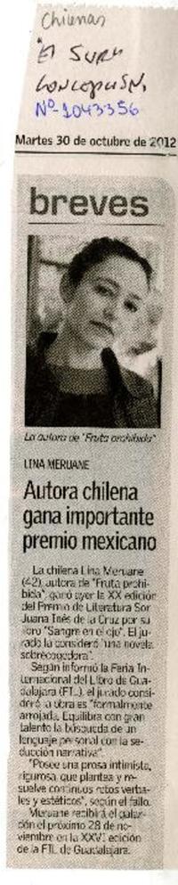 Autora chilena gana importante premio mexicano. [artículo] El Sur (Diario : Concepción, Chile)-- oct. 30, 2012, s/p. .