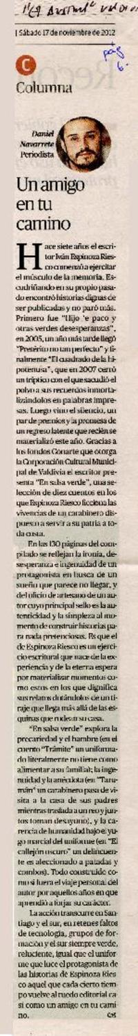 Un amigo en tu camino [artículo] / Daniel Navarrete. Diario Austral (Diario : Valdivia, Chile)-- nov. 17, 2012, p. 6 (suplemento "Austral Letras") .