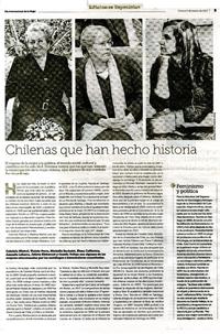 Chilenas que han hecho historia [artículo] / Jorge Aliaga. La Tercera de la Hora (Diario : Santiago, Chile)-- mar. 8, 2013, p. 5 (suplemento "Ediciones especiales") .