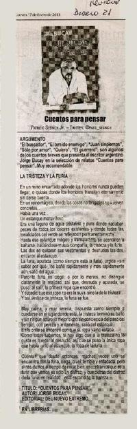 Cuentos para pensar [artículo] / Patricio Sesnich Jr. Diario 21 (Diario : Iquique, Chile)-- ene. 17, 2013, p. 19 .