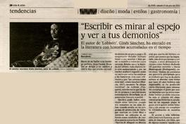 "Escribir es mirar al espejo y ver a tus demonios" [artículo] / Carles Geli El País (Diario : Madrid, España)-- jul. 13, de 2013, p. 28 .