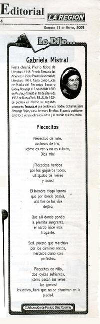 Incluye fotografía de Gabriela Mistral y su poema "Piecitos".