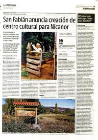 San Fabián anuncia creación de Centro Cultural para Nicanor [artículo] / Carolina Marcos Ch. La Discusión (Diario : Chillan, Chile)-- sep. 3, 2013, p. 19 .