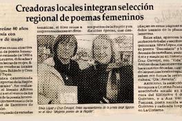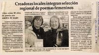 Creadoras locales integran selección regional de poemas femeninos. [artículo] El Observador (Diario : Quillota, Chile)-- sept. 24, 2004, p. 19. .