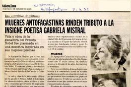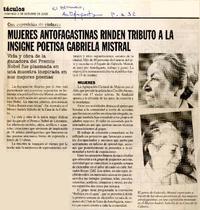 Mujeres antofagastinas rinden tributo a la insigne poetisa Gabriela Mistral [artículo] / El Mercurio (Diario : Antofagasta, Chile) oct. 2, 2005, p. A32 .