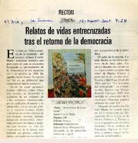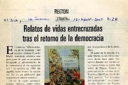 Relatos de vidas entrecruzadas tras el retorno de la democracia [artículo] / El Día (Diario : La Serena, Chile) ago. 12, 2005, p. 28 .
